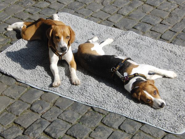 Die ersten Tage waren für uns sehr anstrengend und aufregend, denn wir haben uns ja “Überraschungseier” ausgesucht. Die beiden waren sehr aufgedreht, den ganzen Tag nur am Schnuffeln und Inspizieren, sodass ich mich entschlossen habe, ihnen “Bettruhe” zu verordnen. So lagen entweder mein Mann oder ich mit ihnen im Wohnzimmer auf der Matratze, wo sie sich dann an uns kuschelten und auch mal eingeschlafen sind. Nachts lagen sie immer auf einem drauf, suchten also sehr intensiv den Körperkontakt. Entsprechend gerädert sind wir am nächsten Tag auch aufgestanden. Ihr unbestechlicher Beaglecharme ließ uns unsere Müdigkeit schnell vergessen, weil es keine Stunde gab, in der wir nicht mal herzhaft lachen mussten.